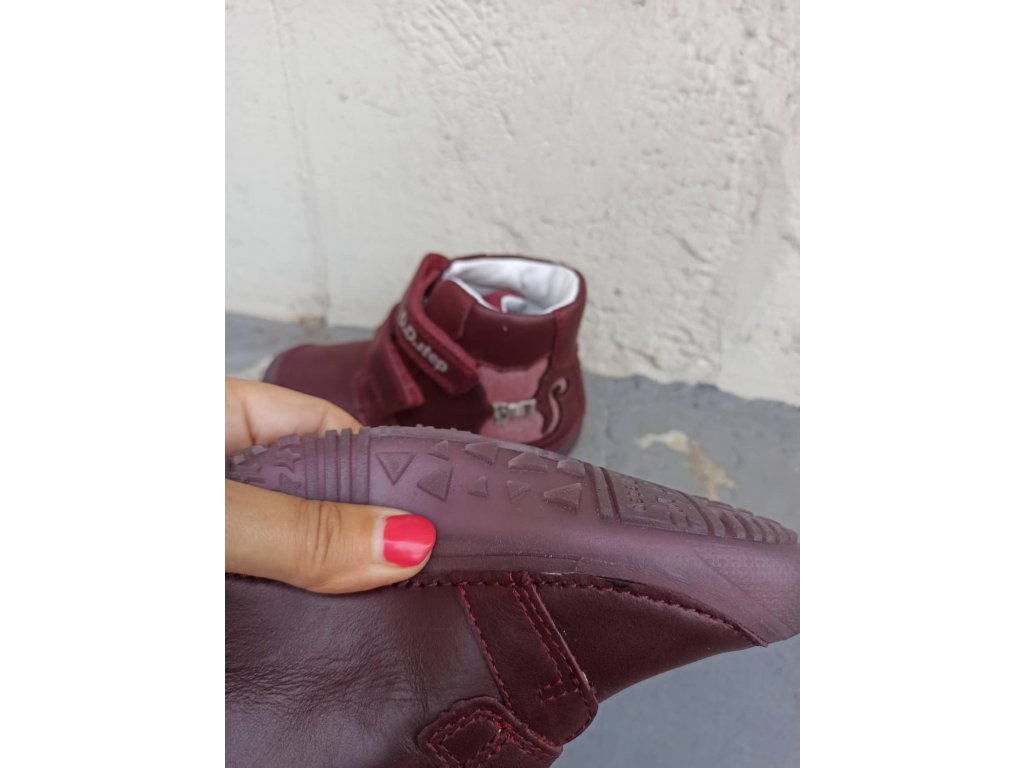 Kožená detská obuv, prechodné topánky zn. D.D.STEP s ortopedickou vložkou a tvarovanou klenbou. Obuv je vhodná pre najmenšie detičky, ktoré sa učia chodiť, pretože sú mäkučké, ľahučké a veľmi ohybné. Sú vhodné na prechodné obdobie. Zapínanie je na suchý zips. Vpredu je vyvýšená guma proti okopaniu.