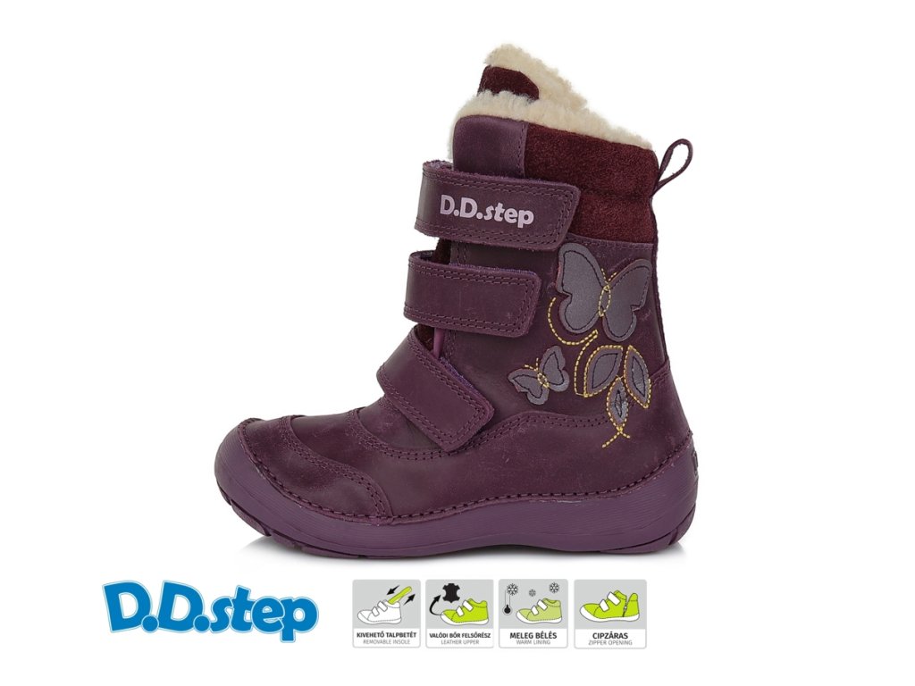 Zimná zateplená obuv od značky D.D.Step. Obuv je kvalitná, certifikovaná. Čižmičky sú vyrobené z pravej prírodnej kože, sú mäkké, ohybné a veľmi pohodlné. Zapínanie je na suchý zips. Stielka je tvarovaná s ortopedickou vložkou. Vložka je vyberateľná, je možné nahradiť ju akoukoľvek inou.