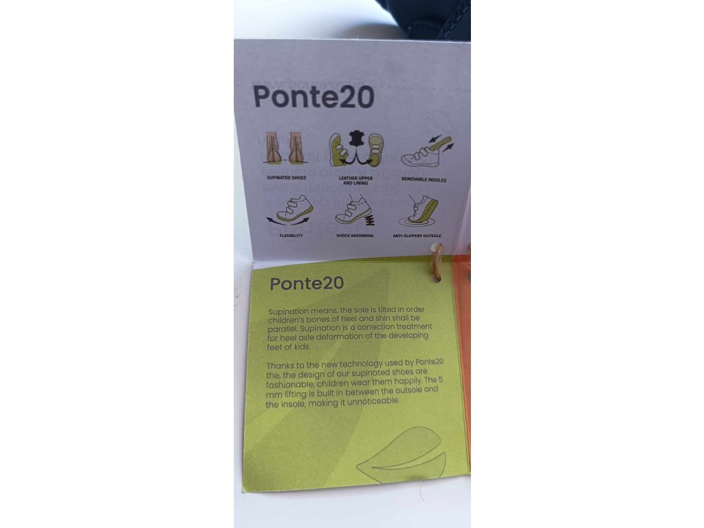 5mm náklon je umiestnený medzi podrážku a vnútorné stielku, takže v podstate nie je vidieť. Tvar špičky je navrhnutý tak, aby tu bol dostatok miesta pre prsty a ich voľný pohyb. Všetky výrobky Ponte20 sú vyrobené z pravej kvalitnej kože. Topánky sú vybavené vnútornou výstuhou päty. Topánky ponúkajú riešenie pre tých, ktorí považujú za dôležité, aby ich deti nosili zdravšie topánky a tým prispievajú k zdravému vývoju detských nôh.